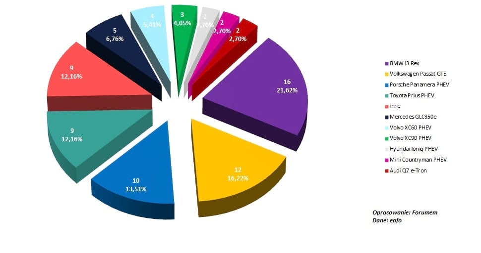 Pojazdów hybrydowych typu plug-in jest zdecydowanie mniej, ponieważ rynek tworzą tylko 74 samochody. Największym zainteresowaniem cieszy się BMW i3 Rex, Volkswagen Passat GTE i Porsche Panamera PHEV.
